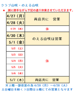 誠に勝手ながら、山咲は下記の通り休業させていただきます。